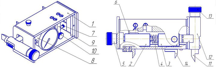 Адгезиметр NOVOTEST СМ-1М состоит из корпуса 1, внутри которого расположена подвижная система ведущего 2 и ведомого 3 штоков, соединенных между собой тарированной пружиной 4. Ведущий горизонтальный шток 2, предназначенный для сжатия пружины 4, приводится в движение вращением винта 5, закрепленного в торцевой части корпуса устройства. На штоке 2 закреплен кронштейн 6 с регулировочным винтом 7, предназначенный для передачи значений линейной деформации тарированной пружины 4 на подвижную ножку индикатора 8. Индикатор 8 крепится к кронштейну 6. Нож 11 для сдвига образца защитного покрытия укреплен внутри вертикального штока 12, перемещающегося при вращении винта 13. Для крепления прибора на поверхности изолированного трубопровода, на нижнем основании корпуса устройства, укреплены четыре опорных ножа 14.