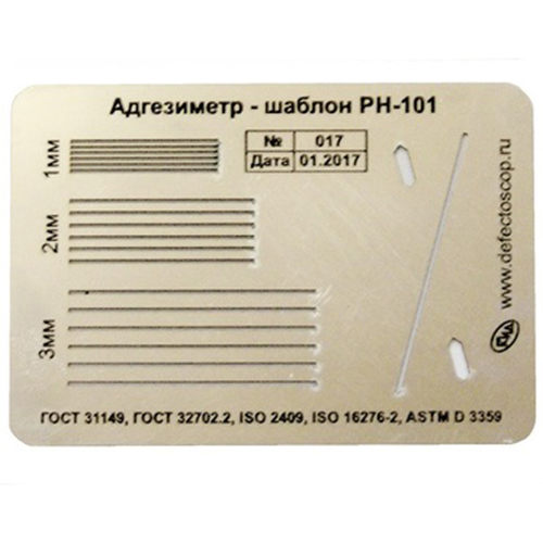 Адгезиметр выполнен в виде шаблона из нержавеющей стали с прорезями для нанесения надрезов.