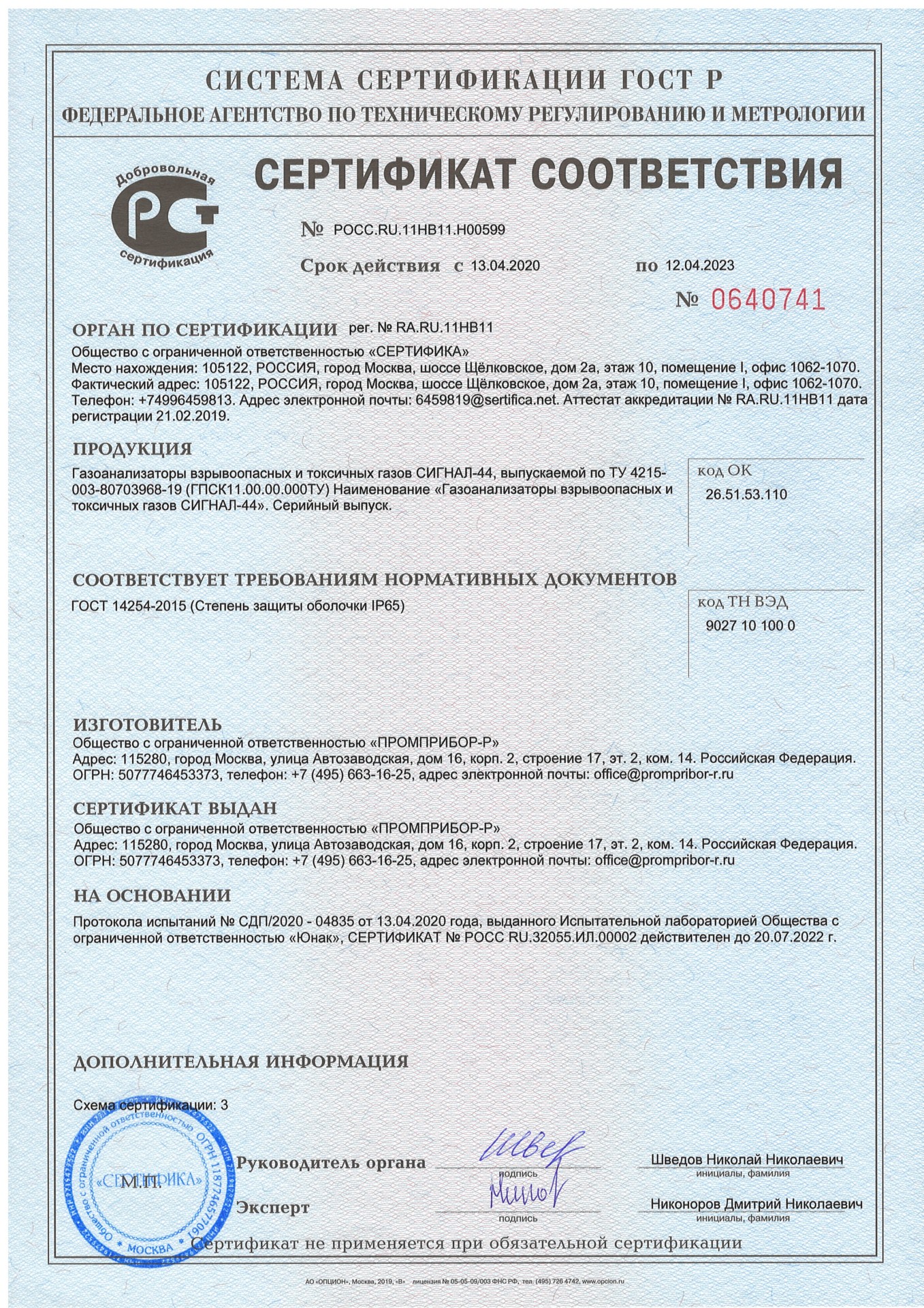 Сертификат соответствия IP 65 № РОСС.RU.11HB11.H00599 срок действия до 12.04.2023
