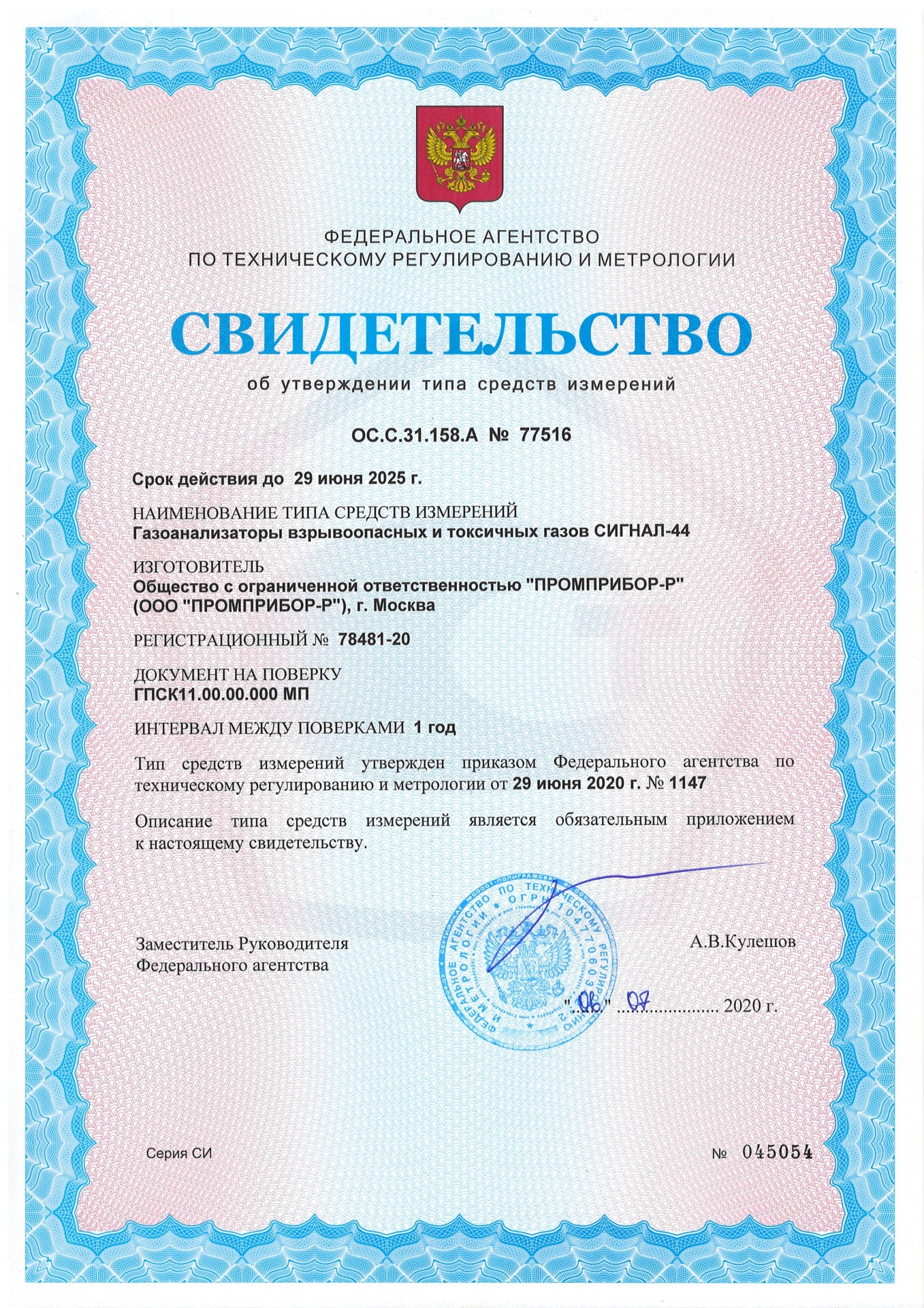 Свидетельство об утверждении типа средств измерений ОС.С.31.158А №77516 срок действия до 29.06.2025 г.