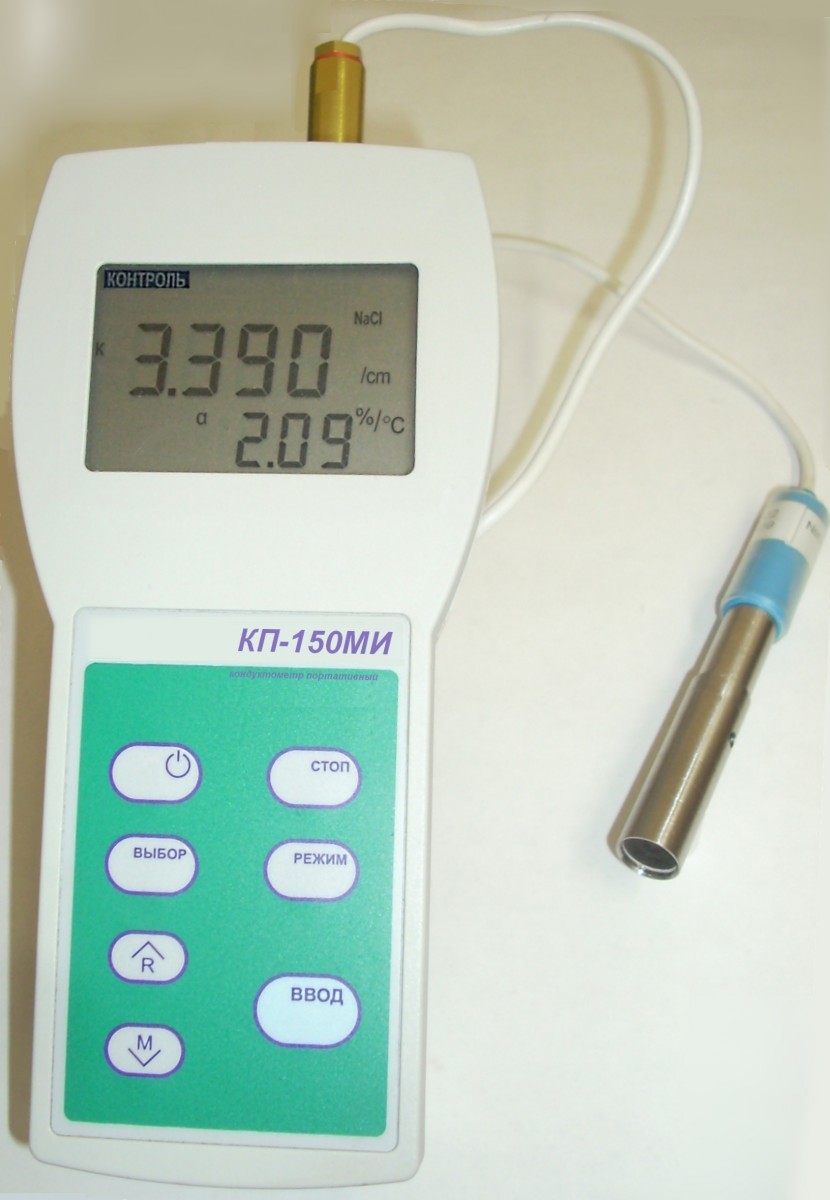 Кондуктометр портативный предназначен для измерения удельной электропроводности (УЭП), и температуры водных растворов. Прибор может применяться для определения массовой концентрации солей в водных растворах в пересчете на NaCl (условного солесодержания — УСС) и производить расчет удельной электропроводности, приведенной к 25 °С (УЭП25) по линейной зависимости.