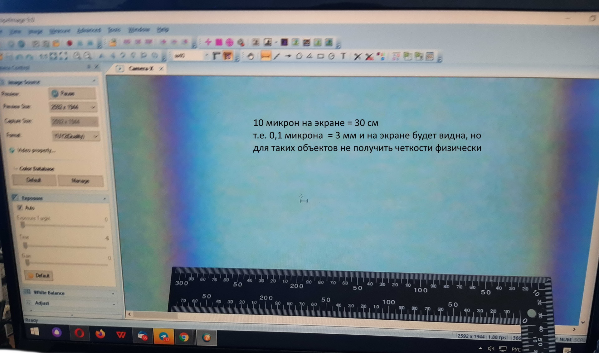 При работе тринокуляра с нашей цифровой камерой и выводе изображения на экран компьютера 21 дюйм на изображении разрешение достигает дифракционного предела, то есть менее 0.3 мкм Программные средства позволяют измерять радиусы, линейные размеры препаратов, площади окружностей и периметры криволинейных объектов. Возможна заводская калибровка вашей системы «микроскоп- камера-дисплей».