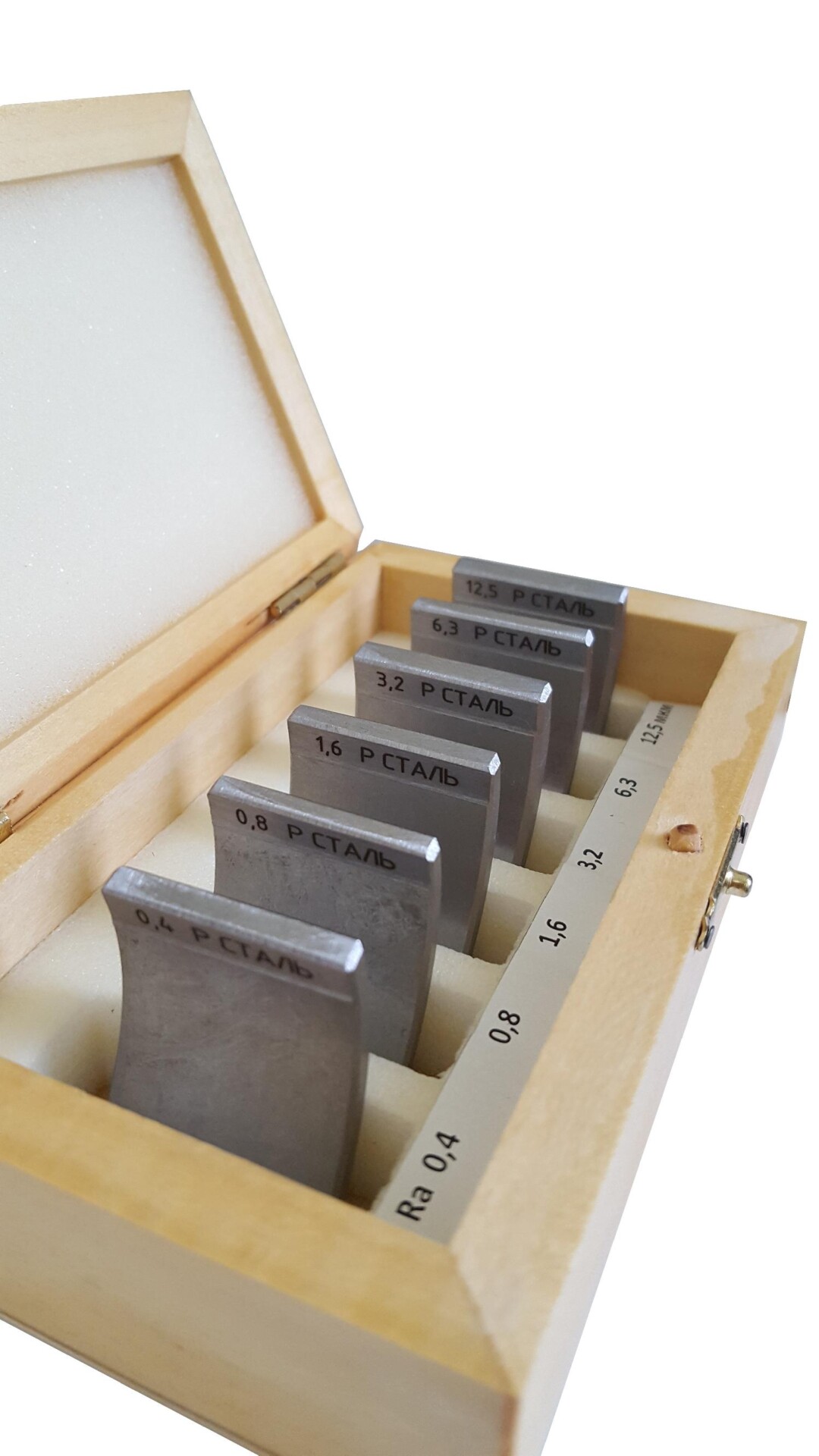 Образцы изготавливаются с различными номинальными значениями параметра шероховатости Ra, выбранными из ряда номинальных значений, допускается дополнительно оценивать поверхность образцов параметрами шероховатости Rz, Rmax, Sm, S и др., значения которых не нормируются и приводятся как справочные по результатам измерений. Также можно заказать комплект из 6 шт, состоящий не из образцов с различными номинальными значениями параметра шероховатости Ra, а комплект только с одним или двумя номинальными значениями параметра шероховатости Ra, например: 0,1; 0,2; 0,3 и далее по выбору заказчика.