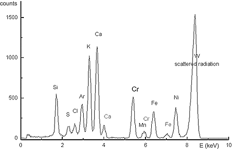 Ниже приведен пример спектра дистилированной воды содержащей 24.5 ppb хрома (Cr). Время съемки 500 секунд, излучение W анода с параметрами рентгеновской трубки 40 кВ 30 мА. Достижимый для данного образца предел определение составляет 35 ppt (что соответствует 3.5 µL).