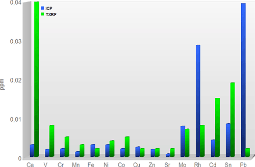 Ниже приведены результаты сравнения пределов определения TXRF спектрометра GNR TX 2000 и типичных пределов определения ICP-MS: