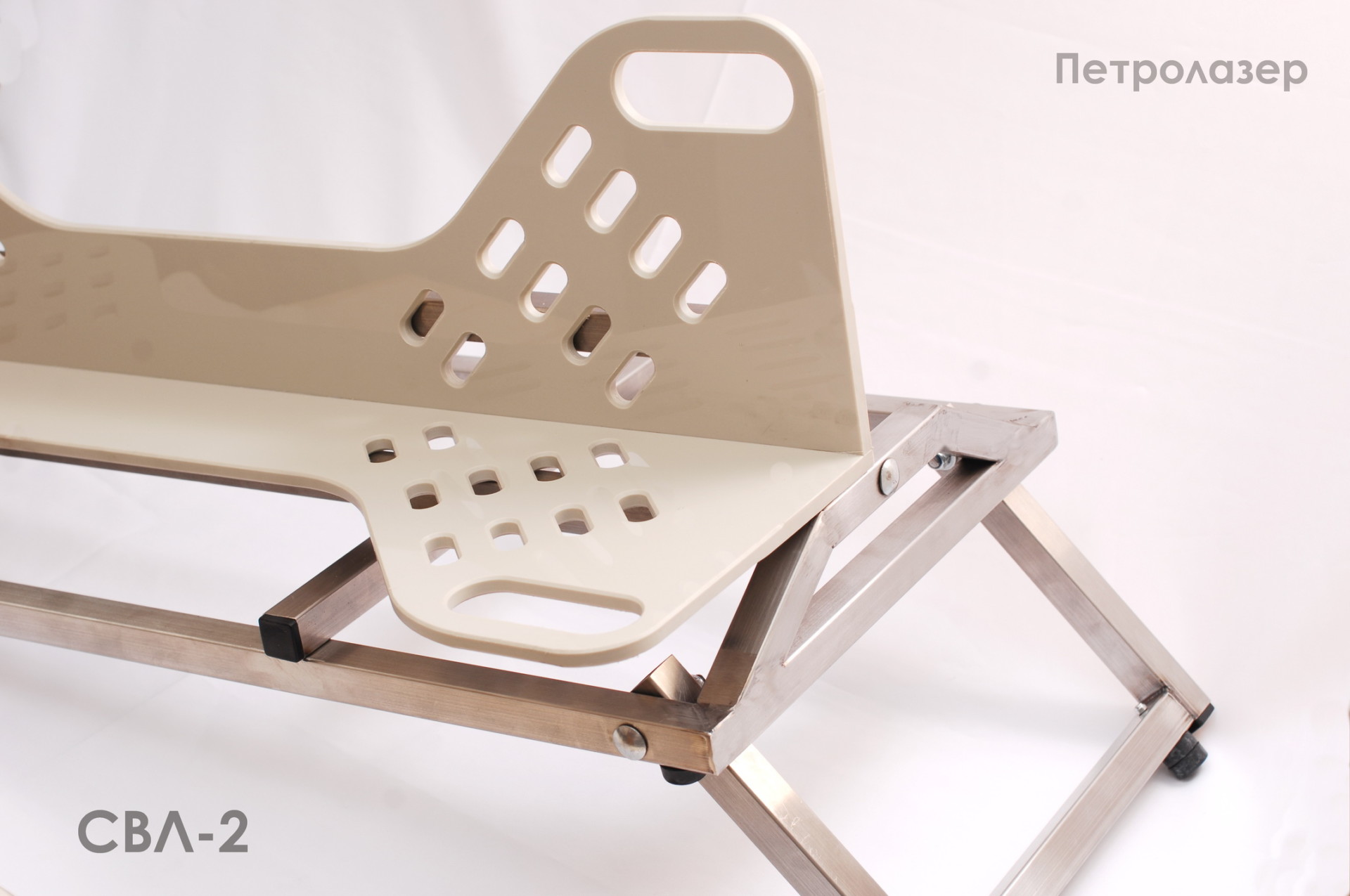 Регулировка положения пациента вдоль продольной оси тела позволяет получить доступ к органам брюшной полости, перемещая их для удобного доступа при диагностике и проведении оперативного вмешательства. Для удлинения ложемента, с целью разместить на СВЛ-2 более крупное животное, в комплектацию может входить удлинитель. При проведении артроскопических манипуляций с использованием артроскопа — к изделию комплектуется дистрактор конечностей. К этому станку ( накладке на стол) мы также выпускаем электропривод, для перекладывания фиксированного животного с боку на бок без усилий и фиксации в любом промежуточном положении. Управление приводом — от педали (см. Фото 6, 7). Поверхности СВЛ-2 выполнены из химически стойкого полипропилена толщиной 10 мм и позволяют любые способы дезинфекции. Для фиксации животного в ложементе предусмотрено множество удобно расположенных отверстий.
