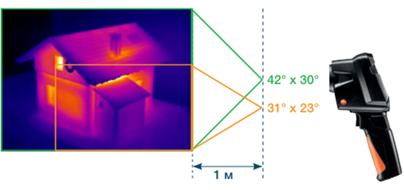 Поле зрения (FOV) определяет область угол видимости тепловизора. Оно даётся в градусах угла и зависит от размера детектора и объектива тепловизора. Его можно сравнить с углом зрения человека.