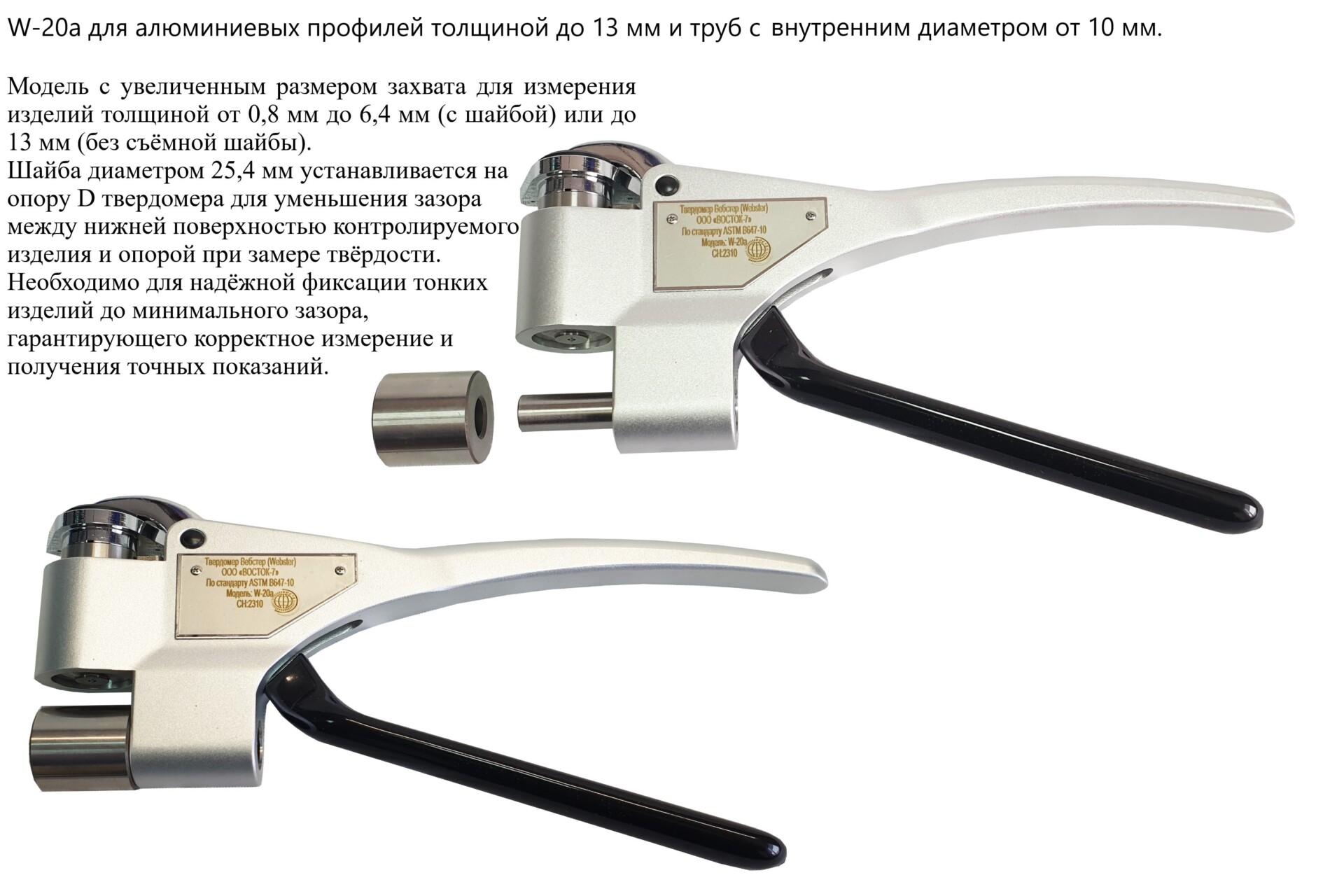 Твердомер Вебстер (Webster) - портативный инструмент для быстрого контроля твёрдости в соответствии со стандартом ASTM B647. Механический индикатор указывает значение твёрдости после сжатия ручек инструмента (аналогично щипцам или пассатижам).