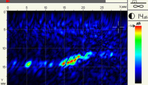 - Возможность проведения ультразвукового контроля вдоль линии сварного шва без поперечного сканирования, за счет большого размера апертуры антенных решеток и сканирования виртуальным фокусом на дальние расстояния, что существенно сокращает время на подготовку околошовной поверхности сварных соединений, повышая высокопроизводительность контроля.