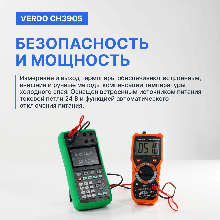 Калибраторы сигналов VERDO CH3905 предназначены для измерения и воспроизведения постоянного тока и напряжения, сопротивления, частоты, температуры с помощью термопар и термосопротивлений. Приборы имеют низкую погрешность в 0,008%.