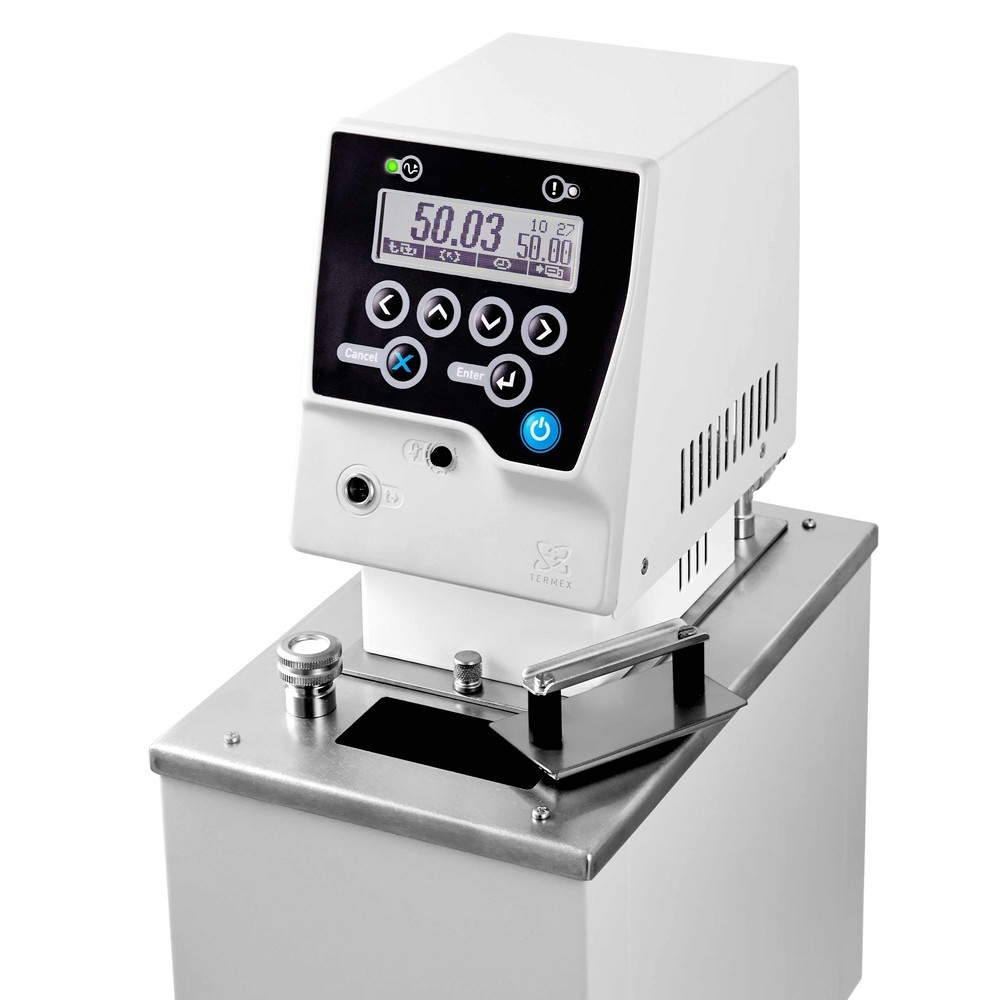 • Термостат позволяет регулировать температуру как по одной из 3-х предварительно заданных уставок, так и по программе, состоящей из 10-ти температурно-временных интервалов с регулируемой скоростью нагрева или охлаждения теплоносителя.